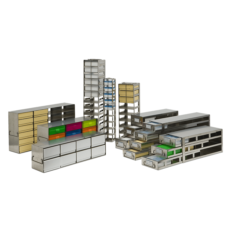 Freezer racks can be made to fit various freezer types including upright, chest or LN2 tanks. Locking-rod and drawer racks are available based on preference.